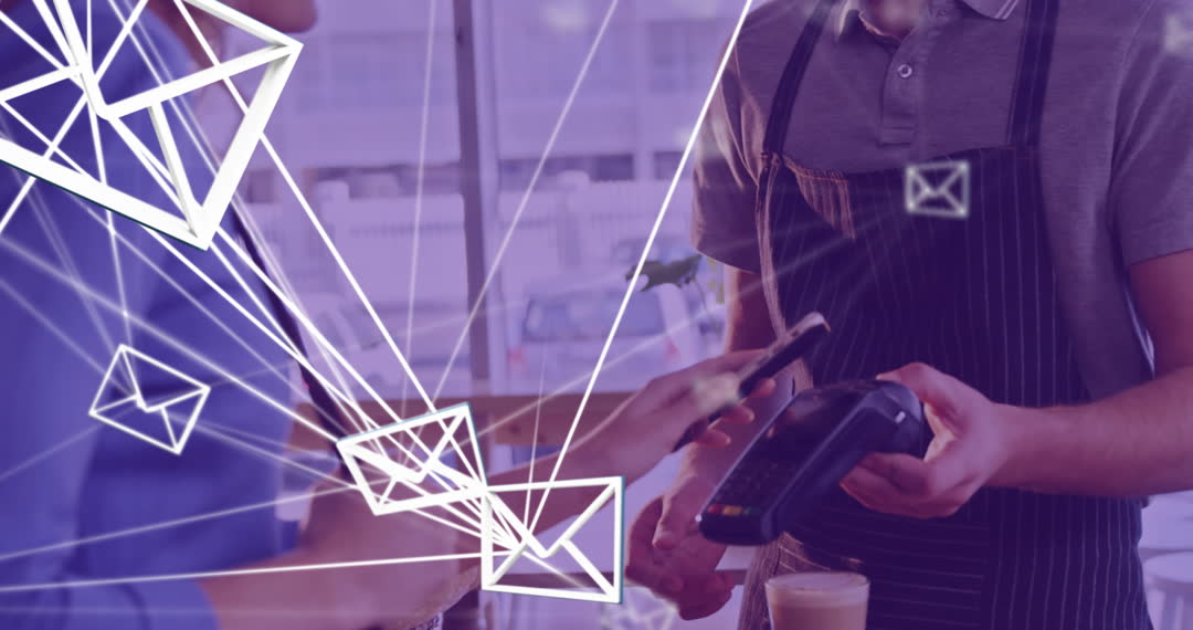 Visual depicting contactless payment using a smartphone at a cafe. Envelopes illustrate digital communication in financial transactions, symbolizing the use of technology in payment methods. Efficient approach in illustrating modern commerce themes in presentations, economic articles, technology advancements, and financial app commercials.