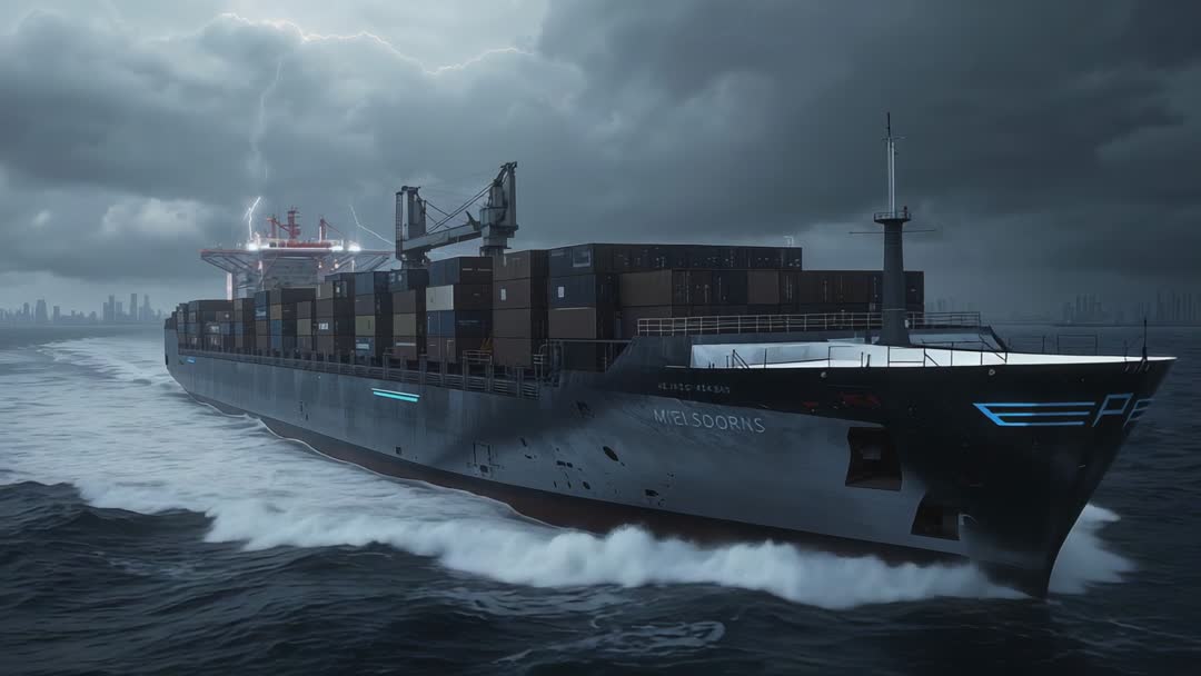 AI Generated Image. Video showing container ship plowing through stormy sea while lightning flashes across heavy clouds and stacked containers filling deck. Camera tracking from bow angle with wake cutting through choppy waves and distant skyline appearing on horizon. Atmosphere staying moody and cinematic with cool blue-gray tones, dramatic lighting accentuating hull lines and container silhouettes. Enhancing corporate presentations on shipping and logistics; supporting news packages about storm impact on ports and supply chains; illustrating maritime safety and emergency response training; providing cinematic background for documentary or commercial projects; creating social media teasers for transport companies. Post-processing suggestions include cropping to widescreen letterbox, applying teal-blue color grade, slowing motion for dramatic effect, and adding lower-third titles for broadcast or web use.