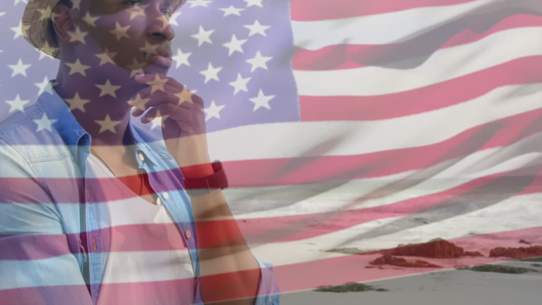 Contemplative African American Overlaid with USA Flag at Beach Video