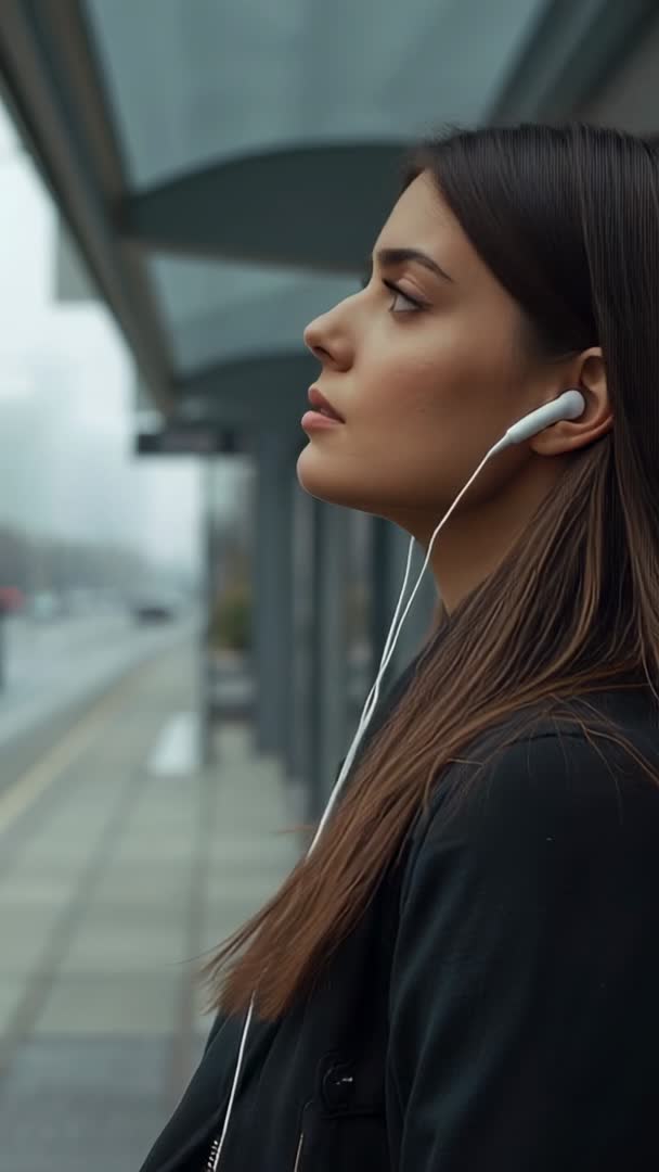 AI Generated Image. Showing side profile of young woman listening to earphones while waiting at transit shelter on overcast morning. Capturing moody urban atmosphere with shallow depth of field and vertical framing ideal for mobile screens. Featuring neutral coat, long hair, and focused gaze toward passing traffic for strong storytelling emphasis. Suitable for advertising commuter apps, public transport campaigns, podcast promotions, music streaming services, mental wellness content, and lifestyle blogs. Working well as social media reels, app splash screens, video headers, and promotional ads requiring cinematic vertical footage. Pairing with ambient city sound or soft piano track to enhance contemplative mood and create emotional connection with audience.