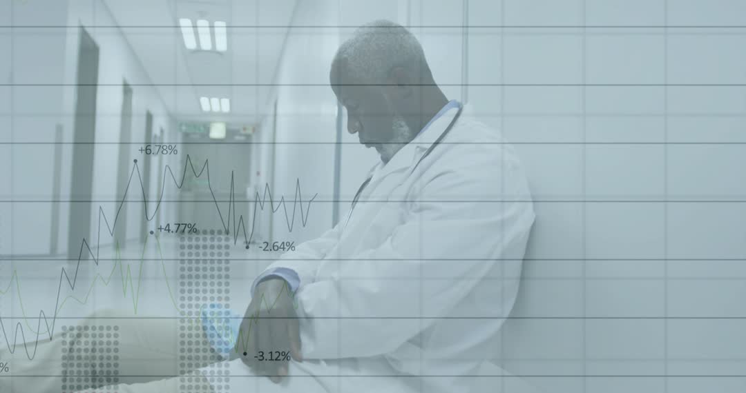Senior male doctor appearing contemplative with graphs layered over his video, representing medical data analysis. This visual communicates themes of healthcare challenges, metrics, and the emotional toll faced by professionals. Useful for illustrating articles on healthcare systems, performance analysis, medical research, or the psychological impact on healthcare workers managing dynamic environments.