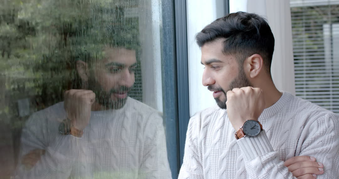A man dressed in a cozy sweater stands pensively by a rain-speckled window, creating an intriguing reflection. His gaze is outward, suggesting contemplation and introspection, accompanied by the warmth of an indoor setting. A watch on his wrist adds a touch of time-awareness and detail to the scene. Ideal for illustrating themes of mindfulness, personal reflection, or indoor lifestyle content.