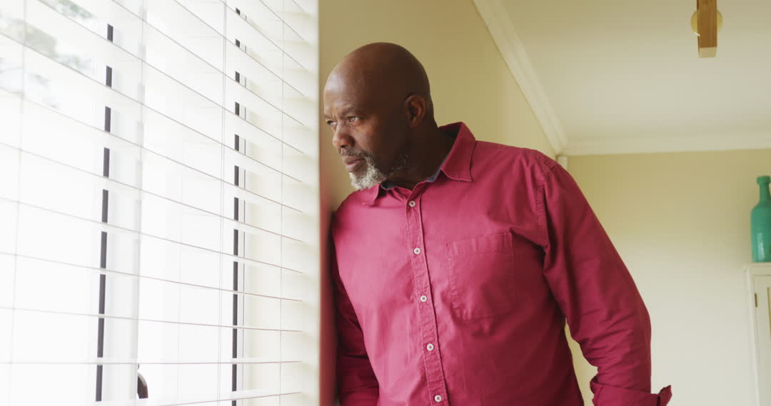 - Contemplative Senior Man Looking Through Window in Red Shirt