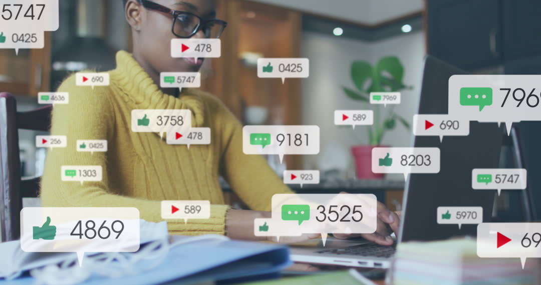 African American woman engaging with digital platforms, using a laptop while surrounded by floating social media likes, notifications, and numbers. Ideal for themes on online marketing, influencer lifestyles, digital tracking, brand communication, and modern work environments. Useful for illustrating concepts in social media strategy guides or digital media courses.