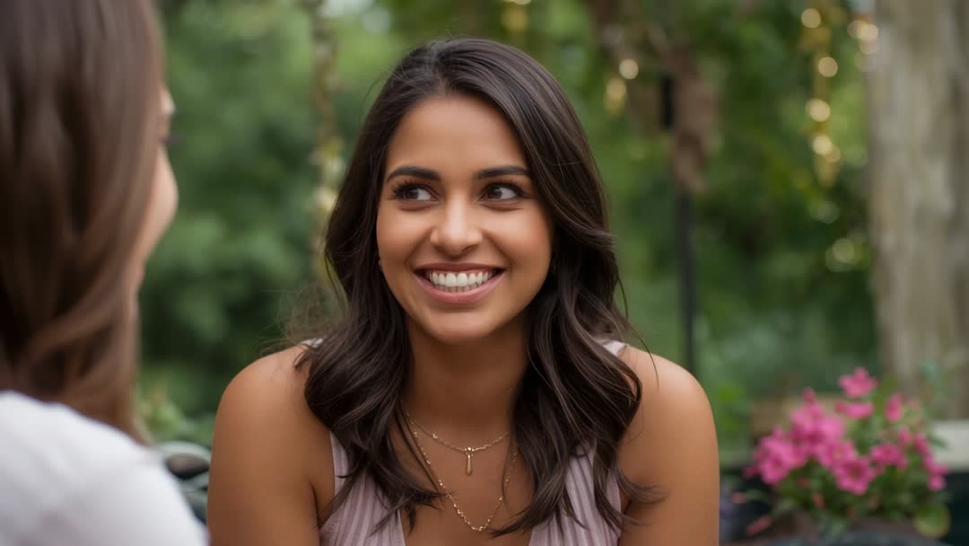 AI Generated Image. Two women are depicted having a lively conversation on a cozy outdoor patio adorned with vibrant greenery and gentle string lights. This AI-generated scene exudes a warm, social atmosphere perfect for uses related to themes of friendship, relaxation, or lifestyle content.