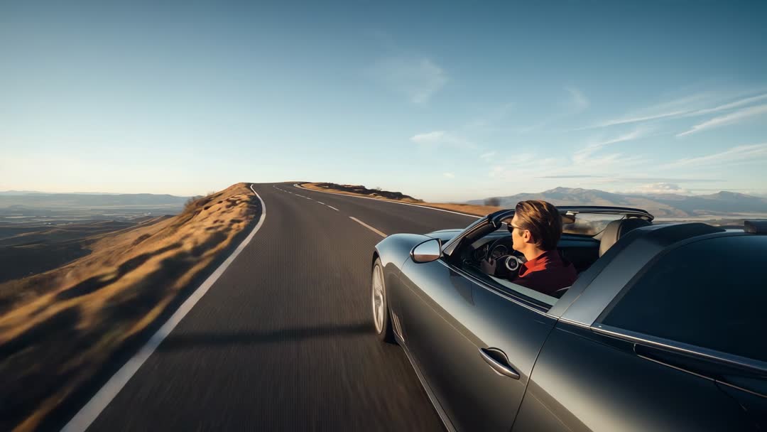 AI Generated Video. Showing convertible driver cruising up winding highland road during golden hour, creating cinematic mood and strong sense of freedom. Wide-angle composition capturing expansive landscape, empty two-lane road, and silver sports car glinting in warm light. Useful for automotive commercials, luxury travel promos, road trip storytelling, lifestyle branding, and social media hero clips. Suitable for background footage on websites, TV spots, dealership promos, car review videos, and travel blog intros. Color grading friendly and easy to retime for slow-motion or speed ramping, providing copy space on left for titles, logos, or calls to action. Delivering aspirational tone for campaigns focusing on performance, escape, and open-road adventure.