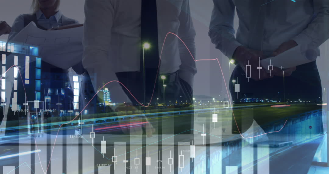 Dynamic blend of business professionals and financial data graphics, perfect for representing concepts related to global finance, investment conversations, or technology in business contexts. Useful for presentations on economic trends, articles about corporate strategy, or videos about data-driven decision making.