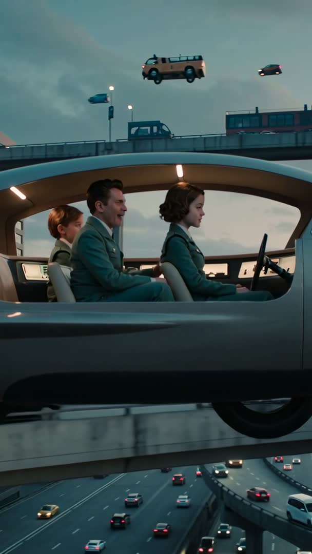 AI Generated Image. Showing three suited passengers riding in sleek metallic hovercar pod, commuting above multilane highway while flying cars pass overhead. Interior cockpit view focusing on calm driver and attentive passengers, conveying corporate travel in futuristic city. Cinematic dusk lighting creating moody, high-tech atmosphere with cool teal and warm amber contrast. Providing ideal content for promoting concept cars, autonomous mobility services, corporate innovation campaigns, urban planning and transport editorials, sci-fi film trailers, mobile-first advertising. Optimizing for vertical 9:16 format for Instagram Reels, TikTok, Snapchat and mobile hero banners. Allowing space for logo placement on lower-third and title overlays. Recommending color grade toward teal/amber contrast, adding subtle lens flare and ambient city sound design to enhance immersive impact.