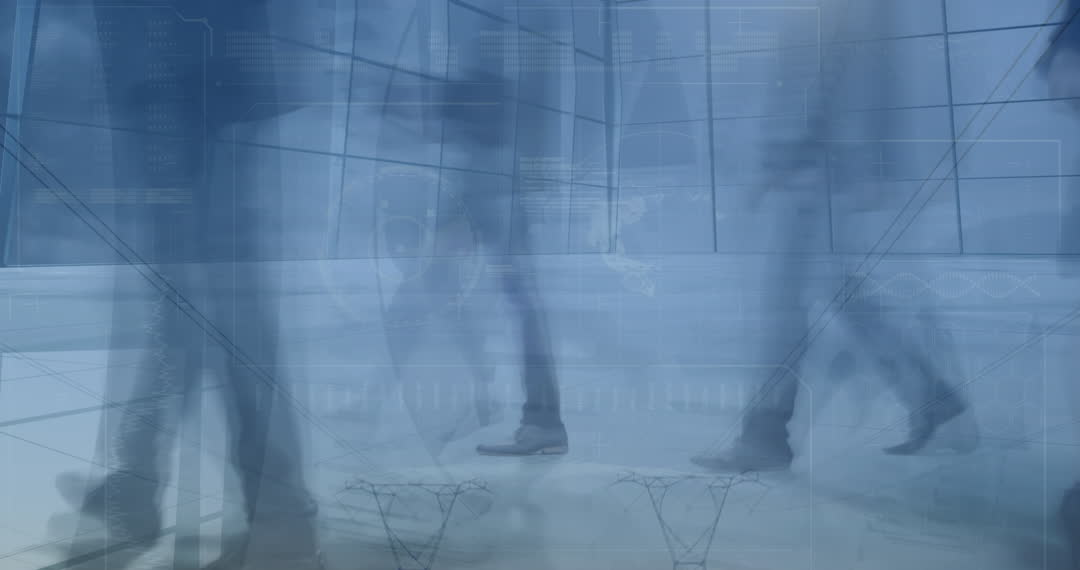 Abstract overlay of financial graphs with time-lapse of diverse businesspeople walking, emphasizing convergence of physical business activities and digital technology. Useful for presentations or marketing materials focusing on corporate dynamics, finance industry innovations, or technology integration.