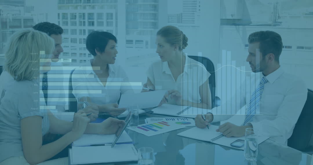 Professional team engaging in business analysis, overlayed with digital graphs indicating financial data processing and strategic planning. Ideal for use in presentations illustrating teamwork, business intelligence, or technological integration in corporate environments.