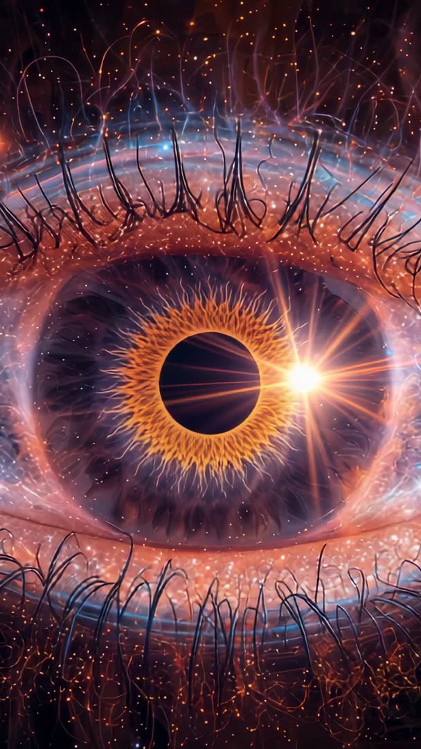 AI Generated Image. Vertical 4K loopable video showing cosmic eye with fiery golden iris and central dark pupil, star flare sweeping across corneal rim and glowing eyelashes, stardust particles drifting through frame. Surreal celestial composition blending astronomical and organic detail, creating cinematic mystical atmosphere. Use in music visuals, sci-fi title sequences, meditation clips, app splash screens, social media vertical stories, YouTube Shorts, Instagram Reels, TikTok videos, live event projections, VR experiences. Production tips: color grading friendly, loopable for seamless playback, adding ambient sound design for immersive impact, overlaying text or logo on dark pupil area for titles or branding, cropping to portrait ratios for mobile platforms.