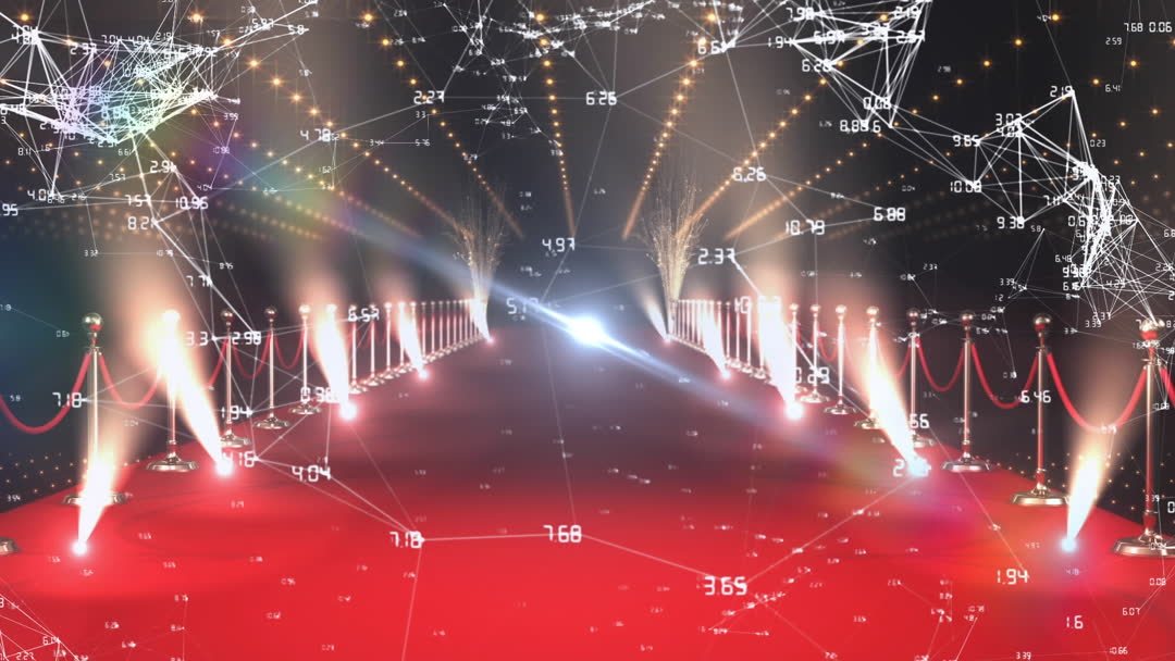 An intriguing blend of a traditional red carpet event with futuristic digital elements and cosmic connections. The lights and strings of digital connections create an electrifying festive atmosphere suitable for events merging traditions with advanced technology themes. Ideal for websites, event promotions, or advertisements that highlight celebrations, digital innovation, events within the metaverse, or immersive experiences such as gala invitations or holiday campaigns embracing both elegance and futurism.