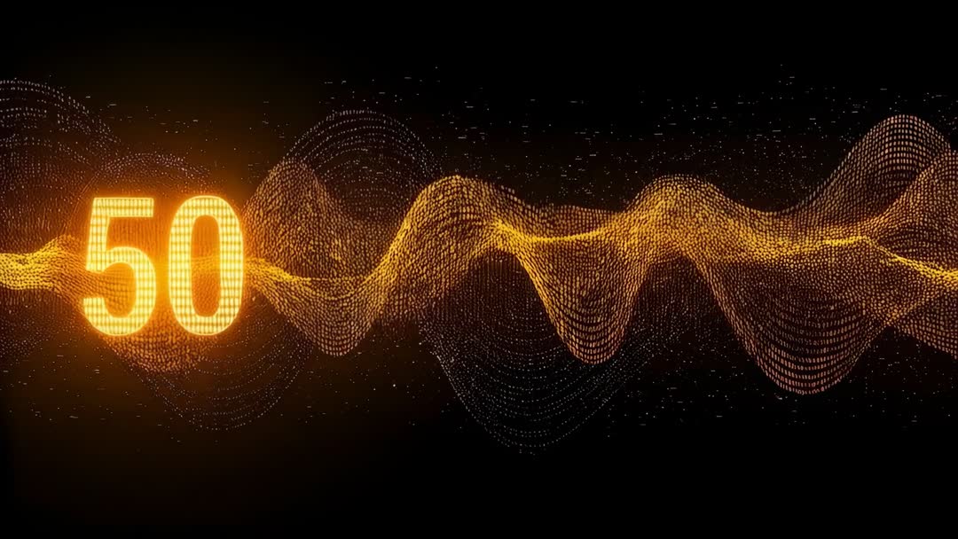 AI Generated Image. Video clip showing glowing LED numeral 50 emerging from flowing golden particle wave across dark void. Dots forming dynamic mesh ripple while sparks trailing along waveform, creating futuristic energy pulse. Clip suiting countdown sequences, milestone announcements, anniversary promotions, and timer overlays for broadcast. Clip suiting brand intros, product launches, event openers, social media teasers, and presentation backdrops. Working well as looping background for signage, stage visuals, or website hero banners. Providing left-aligned clear space for text or logo insertion and offering color grading flexibility for brand matching. Integrating seamlessly into motion graphics projects, title sequences, and multimedia campaigns.