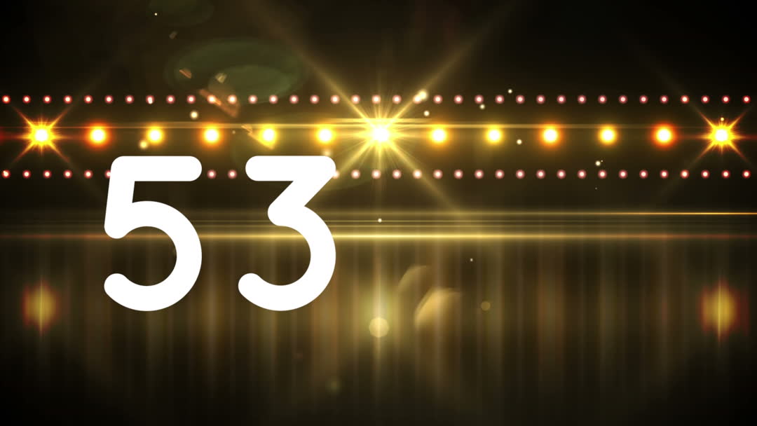 Image depicts animated number 53 with a glowing sequence of yellow and orange light bulbs on a dark background. This vibrant and dynamic representation of a countdown or timer is ideal for use in event promotions, concert advertisements, virtual backgrounds for celebratory events, or any themes involving time or numbers.