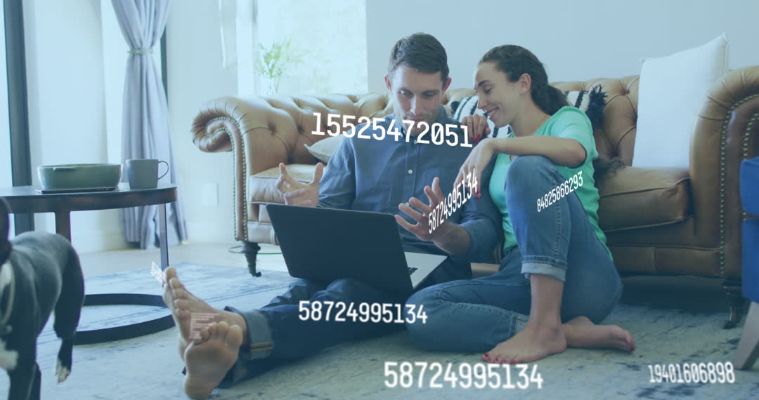 Young caucasian couple is sitting on the floor and engaging in analyzing data on the laptop. Numbers float around indicating digital data processing, reflecting concepts like technology, collaboration, and modern living. Perfect for illustrating home office environments, teamwork in technology, digital interfaces, and innovative workflows in personal and professional settings.