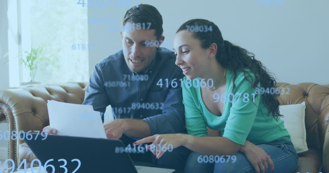 Couple seated on a couch, intently reviewing data on a laptop screen. They are surrounded by a digital overlay of numbers, symbolizing data processing within a business context. This visual can be used for technology-focused article pages, business-oriented advertisements promoting data analysis software, or marketing material for financial services highlighting teamwork in managing finances in digital environments.