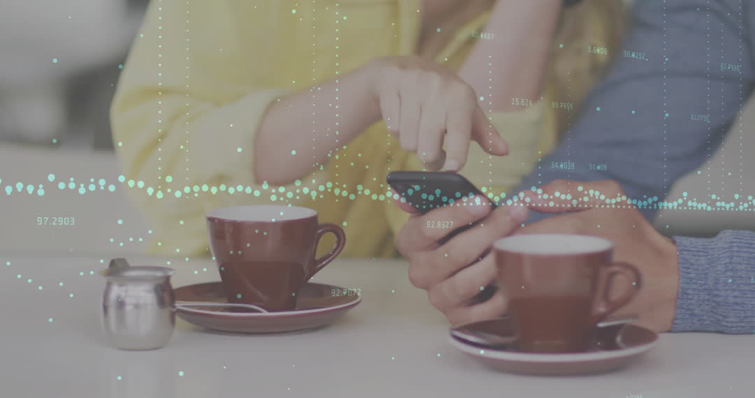 A couple in a café setting focus on a smartphone, examining data with a digital interface illustrated by diagrams and virtual data overlays. This video can represent modern digital communication, data analysis, technology in daily life, or teamwork. Suitable for articles or advertisements related to digital business, communication technology, and connected lifestyles.