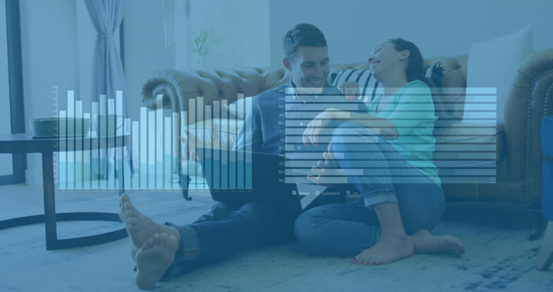 Engaged couple sits in living room with laptop, interacting with superimposed graphics; smart home technology promotional material or data analysis usage.