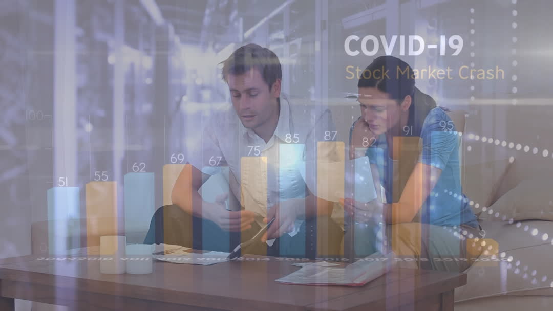 Image depicts a couple engrossed in calculating their budget, set against digitally superimposed bar and line charts and COVID-19 stock market references. Useful for illustrating impacts of global crises on personal finances and budgeting strategies amid market disruptions. Ideally used for financial blogs, articles on personal finance, and economic analyses.