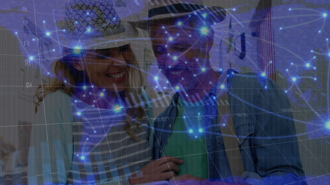 Couple Analyzing Global Data with Futuristic Overlay Video