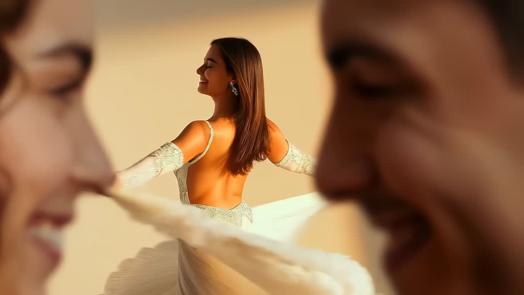 AI Generated Image. Golden-lit cinematic clip showing dancer twirling in backless gown while couple remains softly blurred in foreground, creating intimate romantic atmosphere. Soft warm palette and shallow depth of field emphasizing graceful motion and serene expression of dancer. Useful for fashion promo, romance film intro, wedding highlight reel, luxury event commercial, social media hero clip, or editorial video background. Suggestions for use: apply slow-motion and gentle vignette for cinematic drama, add piano or string score to heighten emotion, crop to vertical for Instagram Reels or TikTok, overlay logo and lower-third text for brand promo or broadcast. Licensing ideas: suitable for lifestyle, fashion, romance, events, dance, advertising, and cinematic projects. Technical notes: 4K-friendly composition, strong foreground bokeh, balanced negative space for headline or caption placement.