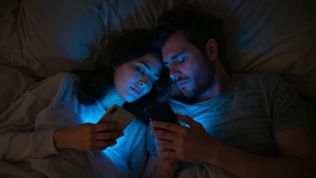 AI Generated Image. A couple is lying in bed browsing their smartphones, faces illuminated by the blue screens. This evokes themes of modern intimacy and relaxation, highlighting the ubiquitous presence of technology in personal spaces. Ideal for topics related to modern relationships, digital age habits, and the impact of technology on intimacy. Can be used in articles, blogs, or presentations discussing evening routines or technology in daily life.