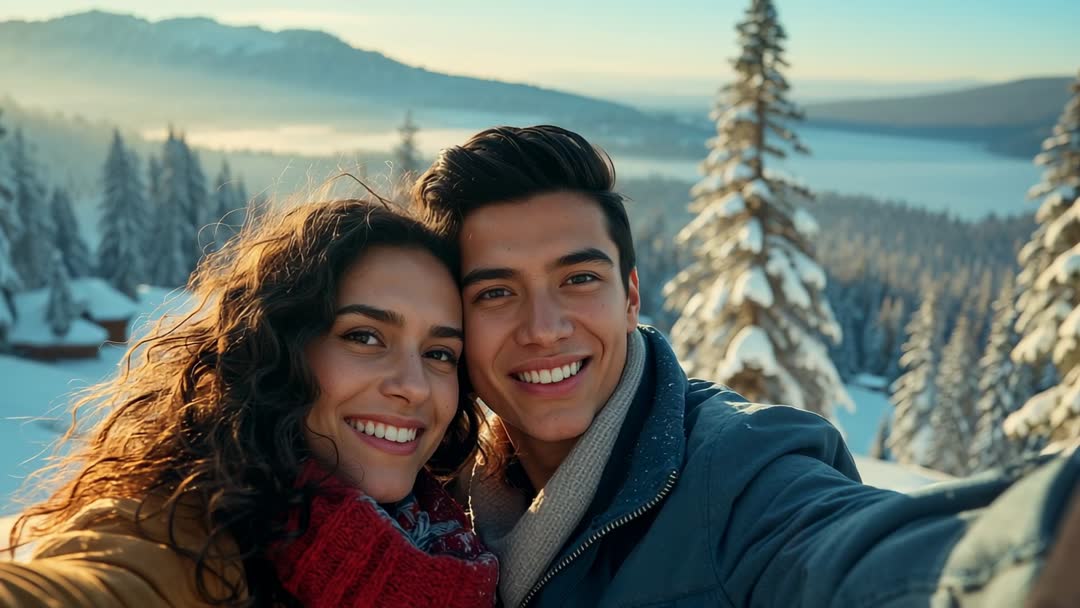 - Couple Capturing Winter Selfie on Snowy Mountainside Adventure