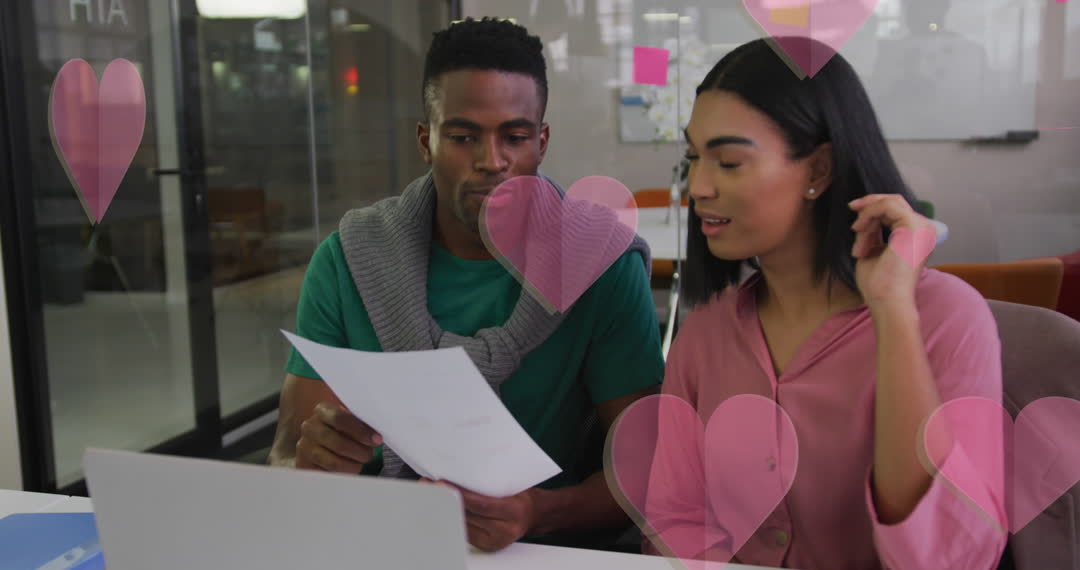 Depicting a couple collaborating on professional tasks, enhanced by heart overlays. Ideal for illustrating creative business concepts featuring teamwork with a hint of romance. Use in marketing materials focused on partnerships, office dynamic themes, or work-life balance expressions.
