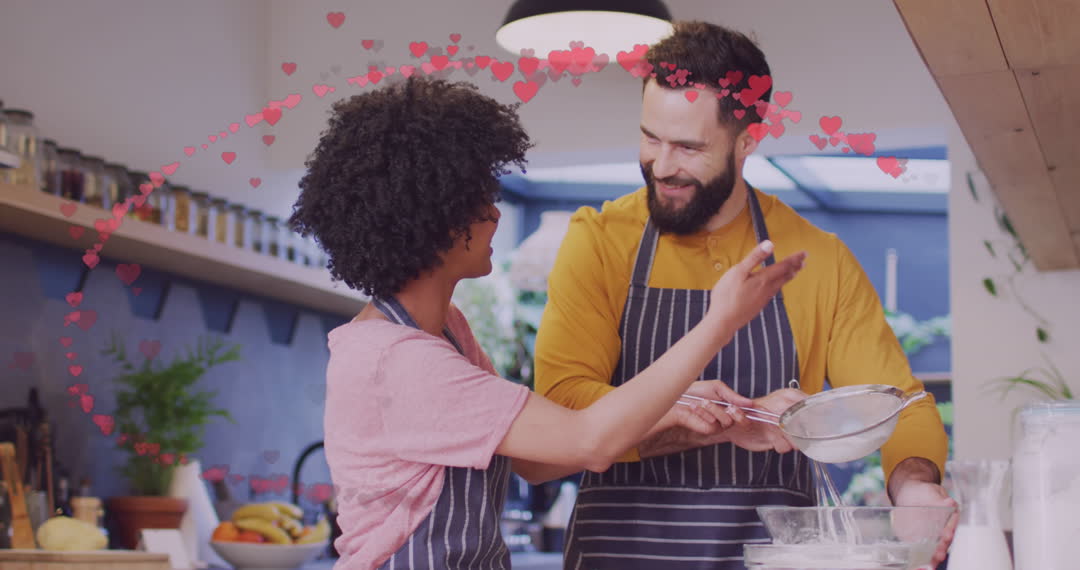 Charming scene shows couple joyfully cooking together in kitchen, enhanced by playful heart animations emphasizing love and relationship bonding. Image suggests themes of togetherness, romance, and joy, perfect for illustrating relationship advice articles, Valentine's Day promotions, or lifestyle blogs focusing on home and family activities.