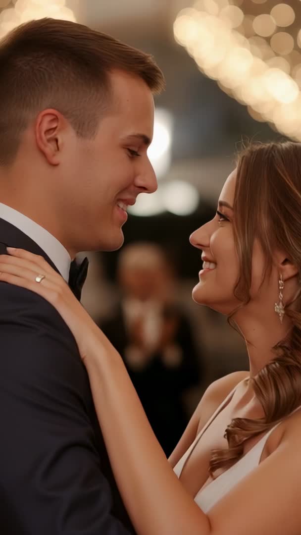 AI Generated Video. Capturing romantic first dance between bride and groom under warm bokeh lights. Featuring close-up on smiling couple with visible ring and elegant attire, creating intimate mood for storytelling. Suited for wedding highlight reels, Instagram and TikTok vertical stories, vendor promotional reels, venue marketing, and bridal editorials. Using slow-motion overlay, soft music, and title cards to enhance emotional impact. Supplying color-graded, cinematic footage for commercial use in event films and lifestyle campaigns.