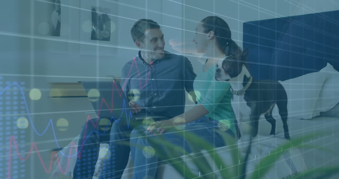 Cozy home environment displaying couple discussing data on laptop. Overlay of graphs and statistical data adds modern business element. Perfect for use in financial lifestyle themes, home finances or data integration articles.