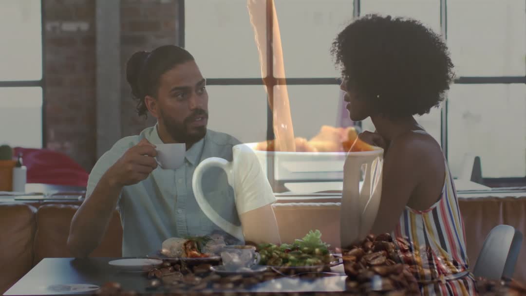 Couple Discussing in Modern Café Loft Setting with Dynamic Graphics Video