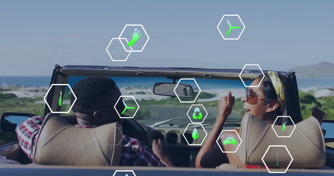Couple enjoys drive in convertible car along beautiful coastal road with eco-friendly animations overlay. Perfect for illustrating sustainable travel, adventure campaigns, and scenic vacation experiences. Ideal for articles or ads focused on eco-conscious road trips and environmental themes.