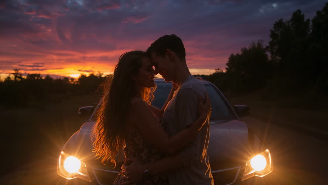 AI Generated Image. Clip showing romantic couple embracing at dusk, leaning foreheads together in soft backlight from car headlights. Warm sunset and purple twilight sky creating cinematic silhouette and rim light on hair and shoulders. Mood conveying intimacy, tenderness, and quiet connection during road trip or countryside escape. Useful for romantic film openers, music video interludes, dating app banners, blog posts about relationships, travel stories, lifestyle advertising, social media reels, greeting card animations, or emotional commercial spots. Color grading suggestions: enhancing warm oranges and deep purples for cinematic contrast, preserving silhouette for dramatic effect. Footage working well with slow piano or acoustic soundtrack, slow motion, and gentle camera push for added emotion. Licensing note: talent release recommended if using recognizable individuals.