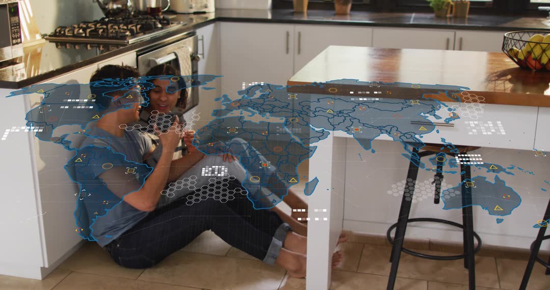Couple sitting on kitchen floor with glowing technology-inspired map overlay suggests embracing modern connectivity in everyday life. Perfect for blogs, articles, or marketing related to digital lifestyles, home technology, global connections, or relationship dynamics in tech-centric environments. Highlights themes of intimacy, innovation, and global communication in the comfort of a home.
