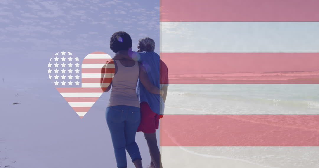 Couple walking by the ocean, wrapped in American flag videory symbolizing patriotism and unity. Ideal for themes of freedom, inclusion, national pride, and unity. Suitable for promoting diversity, relationships, and cultural harmony.