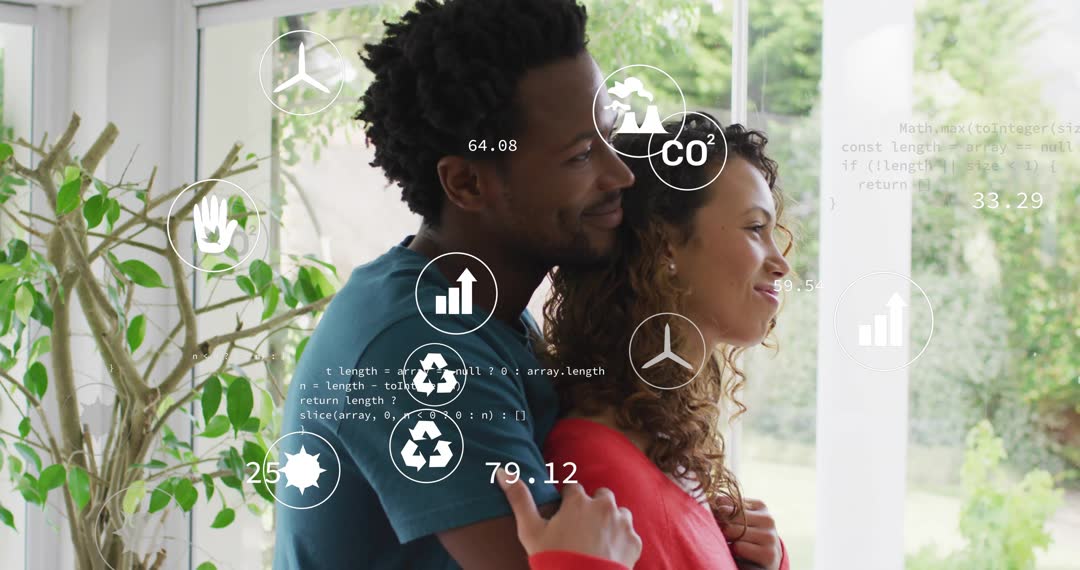 The video showcases a couple physically connecting while standing near a window, with various environmental metrics and icons appearing to fluctuate, indicating a focus on sustainability and modern technology integration. Useful for themes related to eco-friendly living, smart home innovations, romantic relationships with a focus on environment, and lifestyle content emphasizing balance between technology and nature.