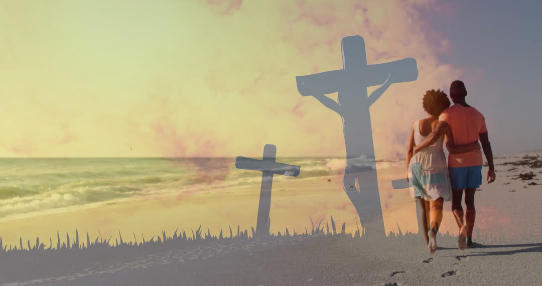 Scene depicts a couple walking along the beach at sunset, creating silhouettes of crossed shadows on ground. Ideal for themes of romance, faith, serenity, or inspirational content, showing connection between love and spirituality along coastline.