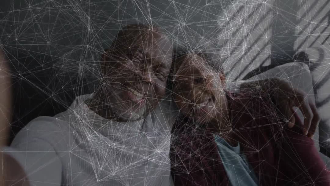 Shows affectionate couple enjoying moment on their couch taking a selfie. Overlay of digital network evokes connection and technology impact on personal lives. Ideal for content about modern relationships, social media use, or technology's role in everyday life.