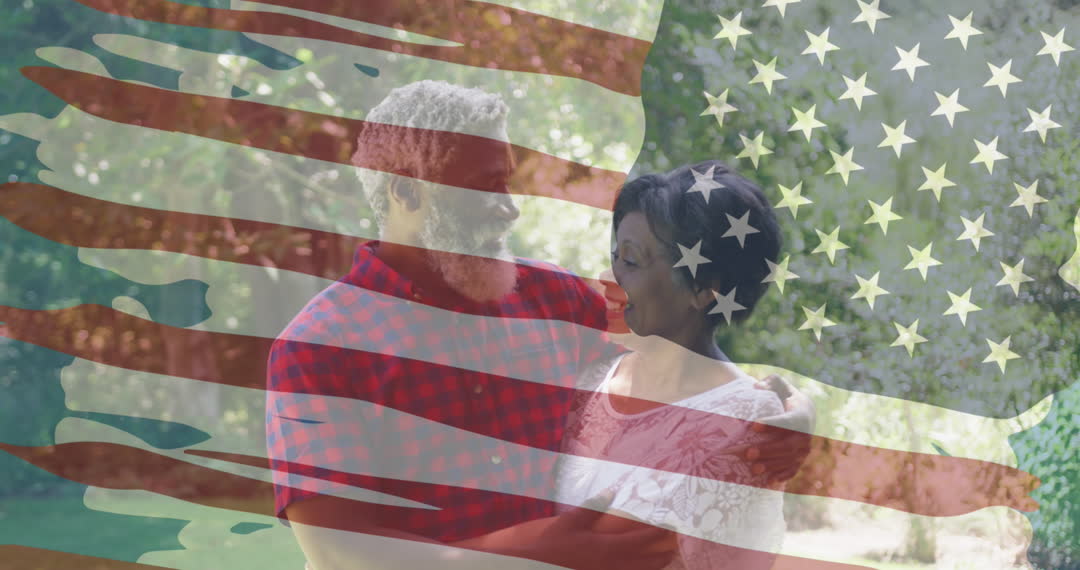 A loving couple is shown embracing outdoors, overlaid with a translucent American flag, conveying themes of patriotism and unity. Ideal for 4th of July promotions, articles on national pride, or visuals emphasizing love and diversity in America.