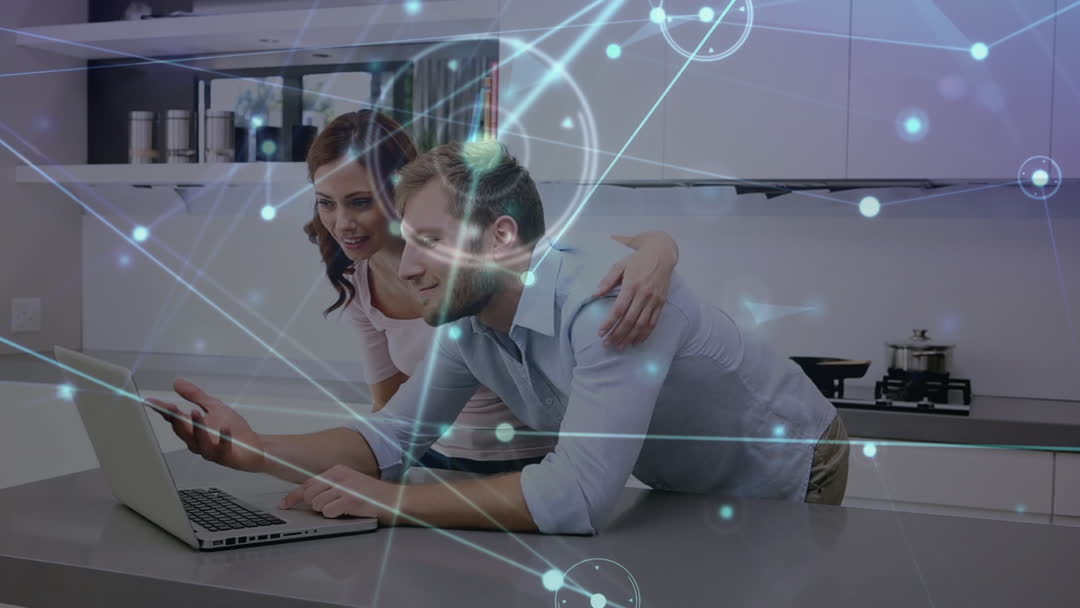 A caucasian couple interacts with a digital network interface overlay while looking at a laptop in a modern kitchen setting. The video symbolizes futuristic technology and global connectivity, making it suitable for use in articles or content related to digital transformation, smart home technology, or modern communication devices.