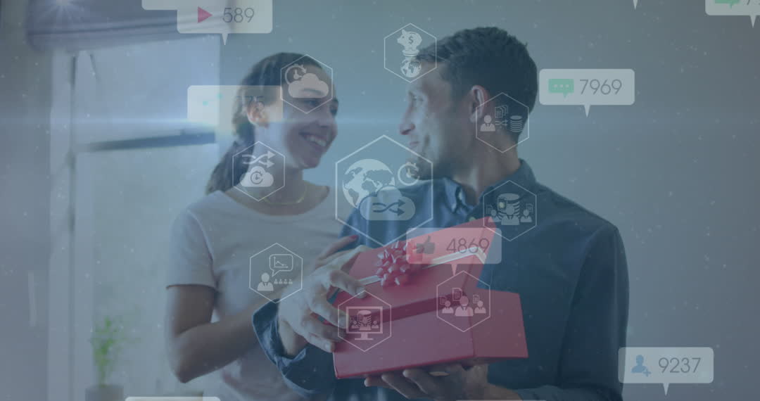 A couple is exchanging gifts at home, rendered with social media icons like a futuristic interface. This dynamic represents modern technology's integration into everyday life, illustrating concepts of social interaction and digital connectivity. Useful for marketing tech-focused themes or illustrating digital communication challenges.