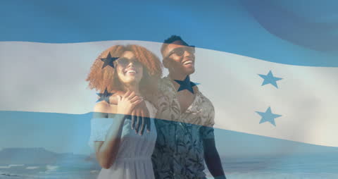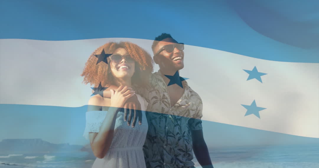 Depicts happy couple embracing at the beach overlaid with animated Honduran flag. Represents themes of romance, freedom, vacation. Useful for travel agencies promoting Honduras as a tropical destination, tourism ads, patriotism-related content.