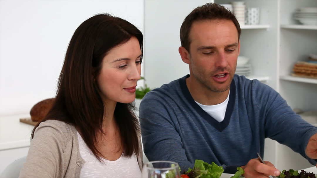 A couple is engaging in a joyful dinner over a healthy salad in a contemporary kitchen space. This video is perfect for promoting wellness and nutrition, depicting family dining settings, or illustrating lifestyle articles on relationships and healthy living.