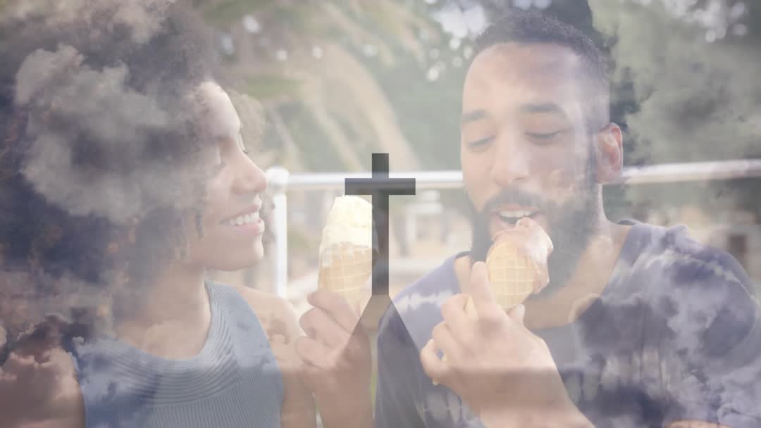 Couple sitting on bench enjoying ice cream with a cross overlay creating a unique and quirky atmosphere. Ideal for food advertising, relationship blogs, lifestyle magazines, and promotional media emphasizing togetherness, leisure, and joy.