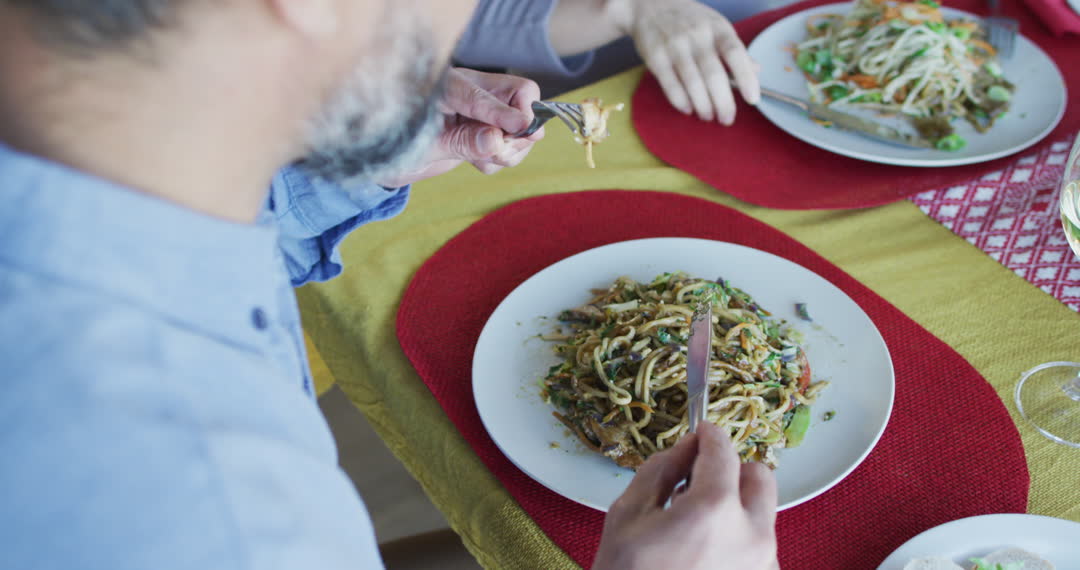 A couple having an intimate meal together in a home dining room with noodles on their plates. This video captures the essence of enjoying a meal at home, strengthening relationships, and sharing a casual dinner setting. Ideal for articles or advertisements about home dining experiences, relationship tips, family time, and food-related content.