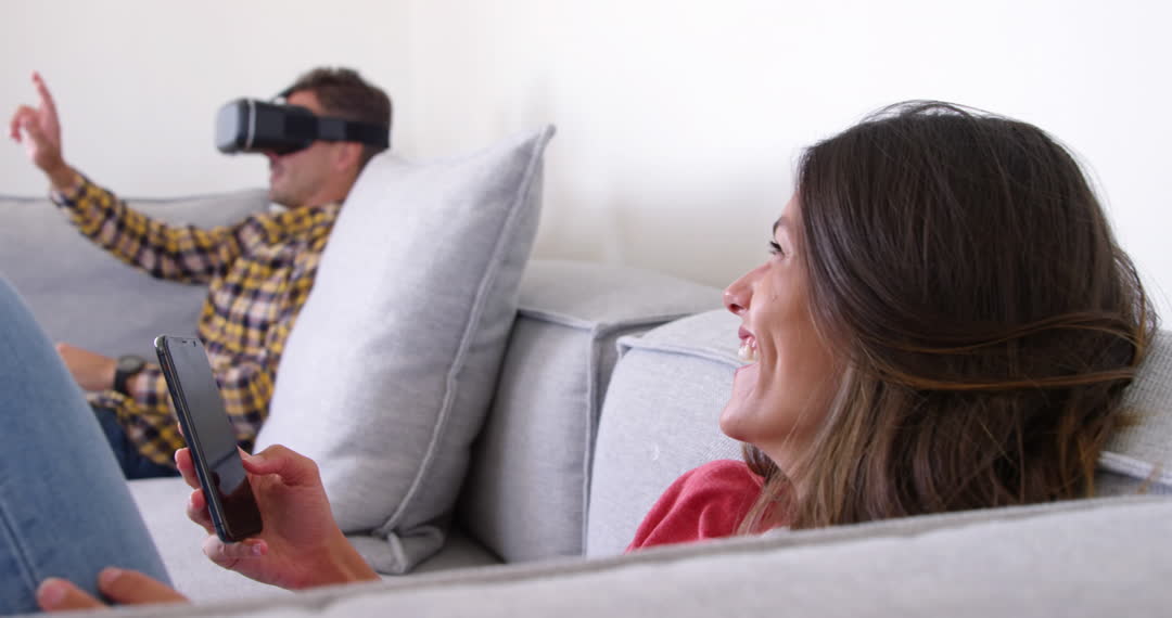 A couple relaxes in their living room, where one person is using a smartphone while the other is engaging with a virtual reality headset. Perfect videory for tech blogs, articles about virtual reality advancements, wireless and multi-tasking trends in modern home technology.