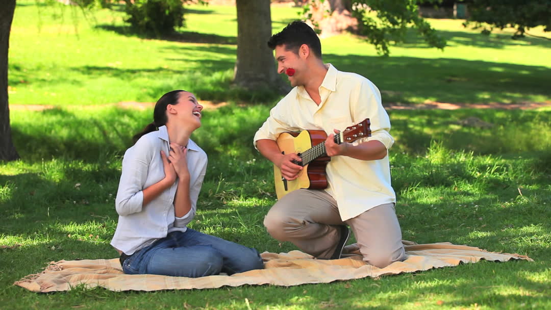 A young couple is enjoying a moment in a sunlit park. The man playfully holds a rose between his teeth while playing guitar, entertaining his laughing girlfriend. This scene conveys joy, romance, and relaxation, and can be used in campaigns or articles focused on relationships, leisure activities, romantic getaways, and the joys of spending time outdoors in a park.