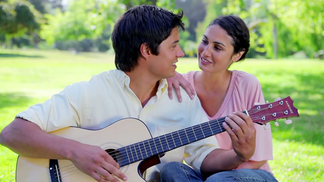 Man playing guitar with woman sitting close, sharing joyful moment in green park. Atmosphere highly suggests romance and connection. Perfect for themes exploring love, musical hobbies, relaxation, lifestyle blogs, greeting cards, and promoting outdoor activities.