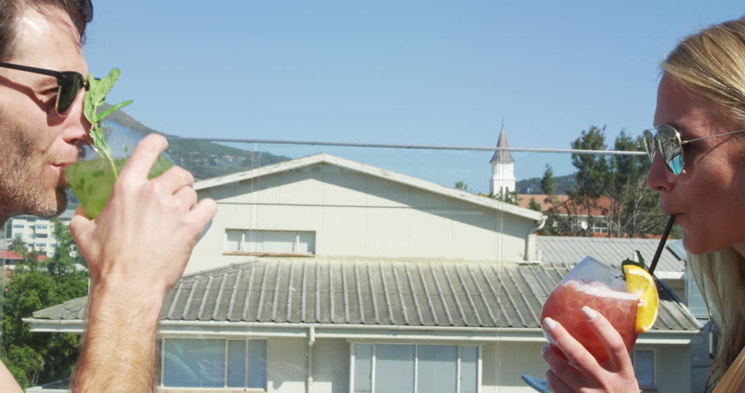 - Couple Enjoying Refreshing Cocktails by Hotel Pool on Sunny Day